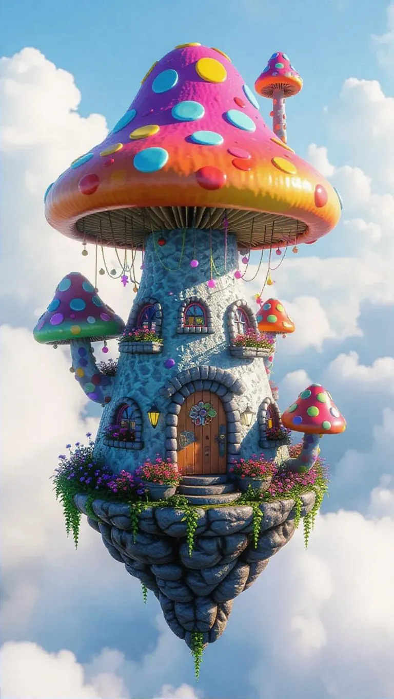 Small mushroom-shaped habitats crafted from a blend of cloud and vibrant dreams, floating gently above the feathery clouds. Brightly colored caps with unique patterns and dots, sturdy twisty stems. Tiny doors and windows with fluttering textiles, flower boxes brimming with delightful flowers, enhancing the whimsical charm.