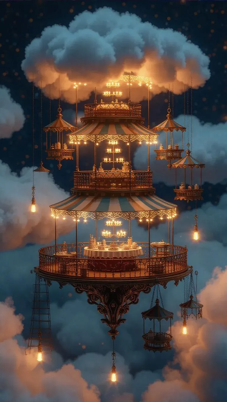 A whimsical floating market atop fluffy clouds, featuring elegant, artistic stalls adorned with delicate lace and dreamlike, ethereal lighting that casts a magical glow, creating a surreal and enchanting atmosphere.