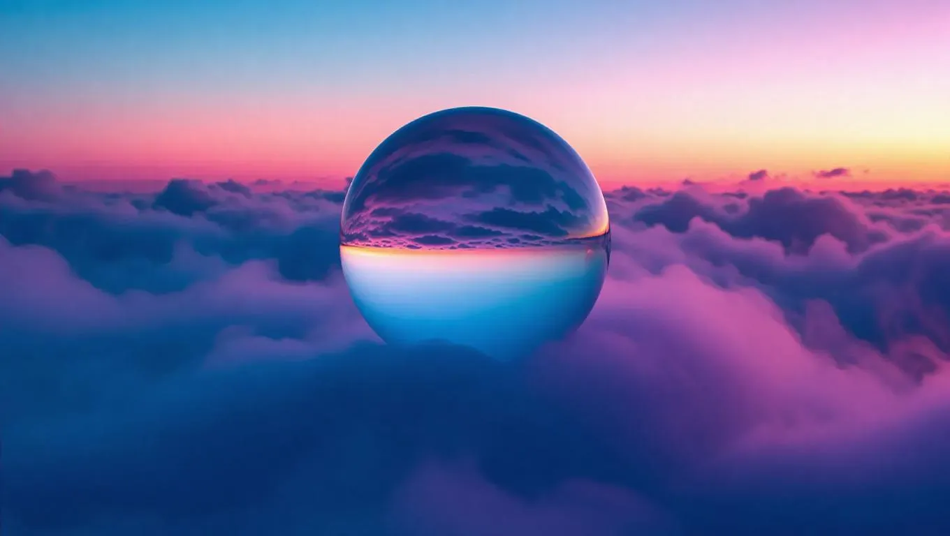 An ethereal crystal orb resting on a silken cloud, capturing the radiant colors of the horizon, with soft fog drifting below, establishing a magical and vibrant atmosphere.