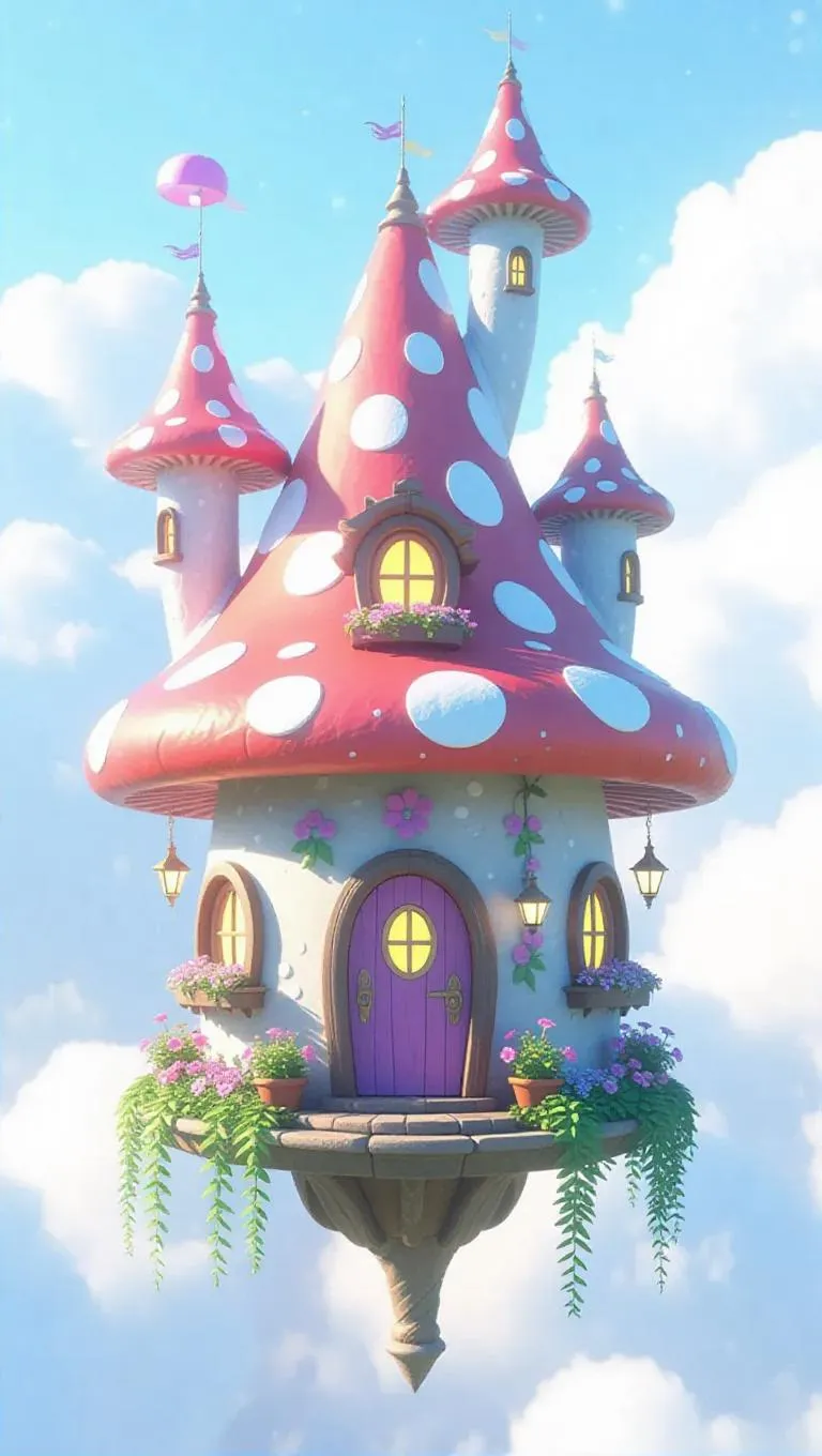 Narrow, mushroom-shaped cottages crafted from a combination of cloud and starlight, floating gently above the fluffy clouds. Brightly painted caps with quirky patterns and spots, thick swirled stems. Tiny doors and windows with flowing curtains, flower boxes filled with enchanting blooms, enhancing the magical aura.
