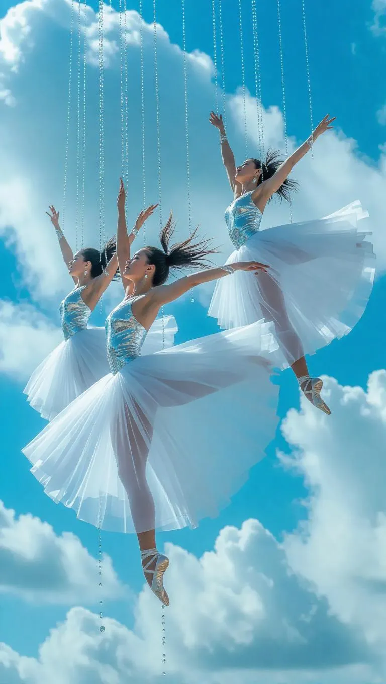 9. Graceful dancers in shimmering white costumes, suspended by cascading water harnesses, perform intricate routines amidst fluffy rain clouds. They twirl and somersault, guided by gentle updrafts, their movements synchronized to soft, ambient music. The sky serves as a vast, ethereal canvas, enhancing the mesmerizing spectacle.