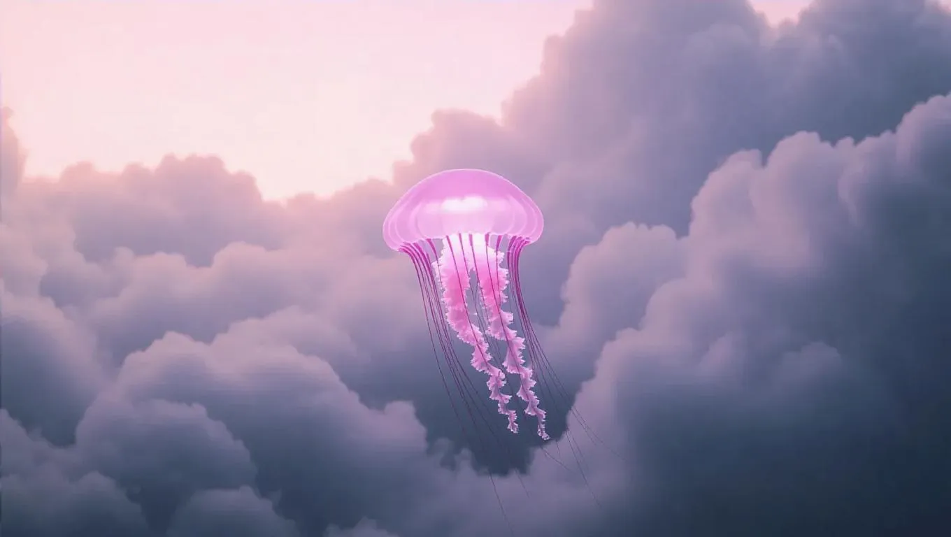 A luminescent jellyfish hovering delicately through grey rain clouds, soft pink sky glowing with a dreamy, otherworldly aura, creating a serene and mystical atmosphere