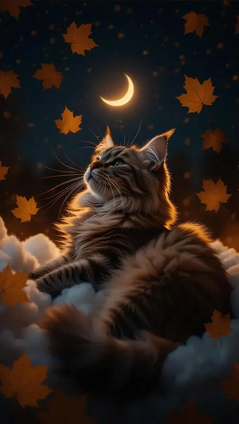 A fluffy cat curled up on a cotton-soft cloud, gently swatting at drifting golden leaves, surrounded by a gentle dusk sky with fading daylight and a glowing crescent moon, creating a whimsical and magical atmosphere.