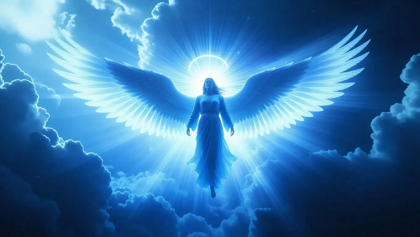 An angelic being soaring above dark, billowing clouds, wings spread wide, halo of radiant light surrounding them. The sky is a striking, dramatic indigo, evoking a sense of divine intensity and grandeur.