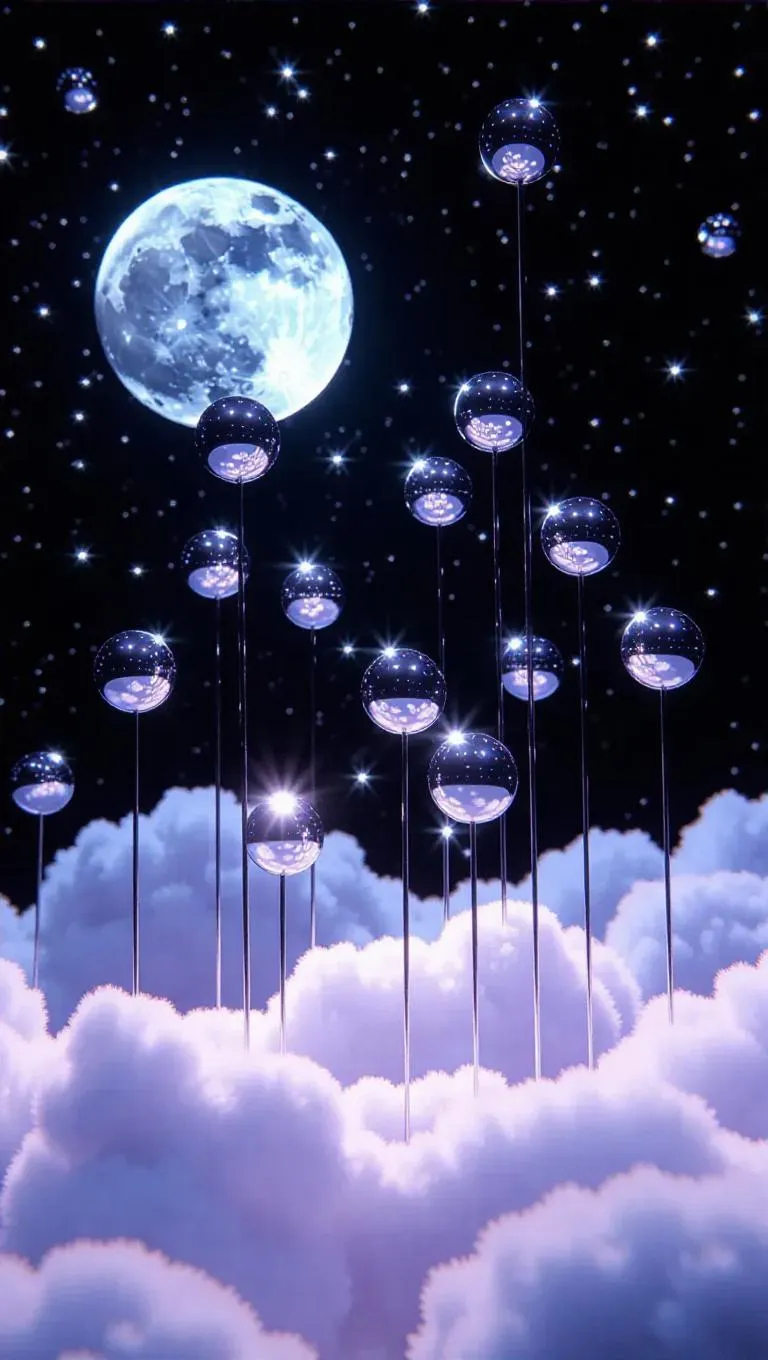 6. Huge moonstone pins shimmer brightly on a puffy cloud layer, players roll airy balls dotted with astral shards, striking pins that fragment into rays of silver light, ringing out like a chorus of tiny celestial bells.