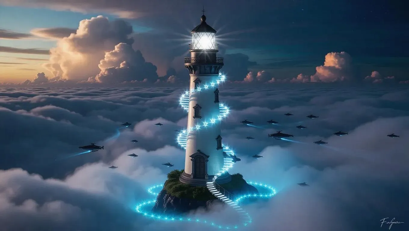 An ivory lighthouse crowned with prismatic crystals floats serenely above swirling cloudbanks, its spiraling beam slicing through cottony vapors in rhythmic pulses. Ethereal glowworms swarm around the structure’s art nouveau filigree, their bioluminescent trails weaving through cumulus formations that shimmer with embedded stardust. Below, schools of winged fish flit between cloud reefs while solar-powered airships cast elongated shadows across the vapor sea. Dawn’s first rays create halos around the lighthouse’s obsidian foundation, where cloud matter solidifies into temporary staircases. Dramatic low-angle perspective, backlit volumetric lighting, balancing architectural grandeur against infinite skyscape.