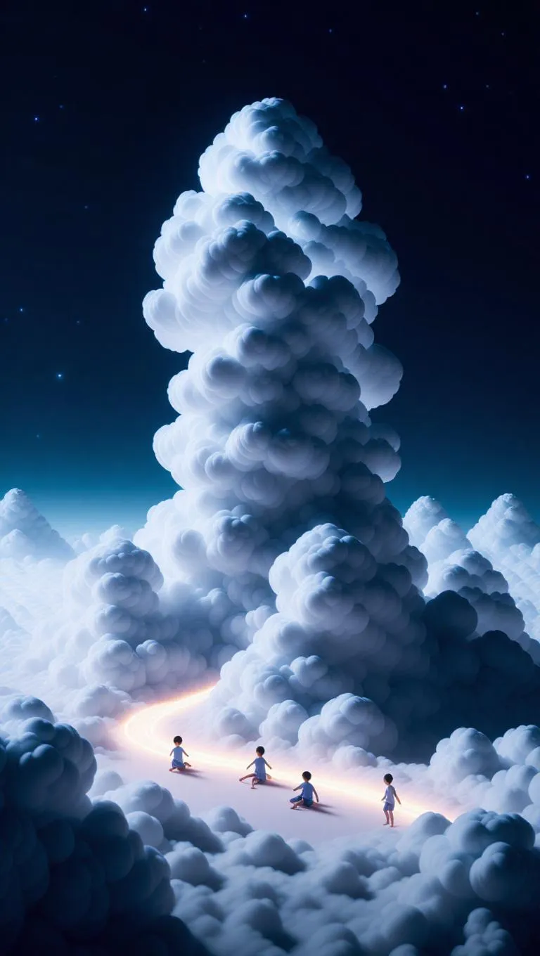 17. Towering cloud slides unfurl down from the dusky sky, their surfaces dusted with shimmering rain. Children slide down at breakneck speed, leaving behind long, luminous trails of moonlight that arc gracefully through the air. At the base, a soft, fluffy cloud trampoline awaits, and every joyful jump sends countless sparkling specks flying into the surreal atmosphere.