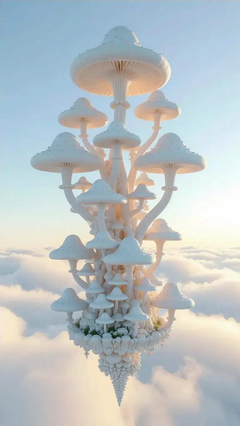The sculptures are constructed from a buoyant biodegradable material that can float lightly on the clouds. They take the form of fairytale creatures, mushrooms, or surreal landscapes. These sculptures float gently, enhancing an enchanting and whimsical environment. The early morning sun brightens them, creating beautiful shadows on the clouds below.