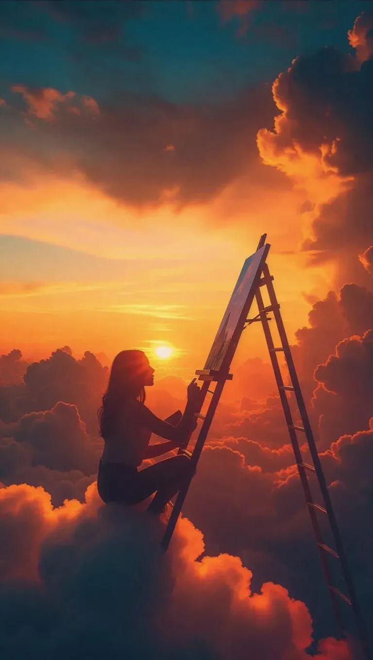 A girl crouched on a ladder resting on a fluffy cloud, passionately painting the sky with each stroke, transforming the colors of the sunset into a mesmerizing blend of warm oranges, capturing the magic of twilight