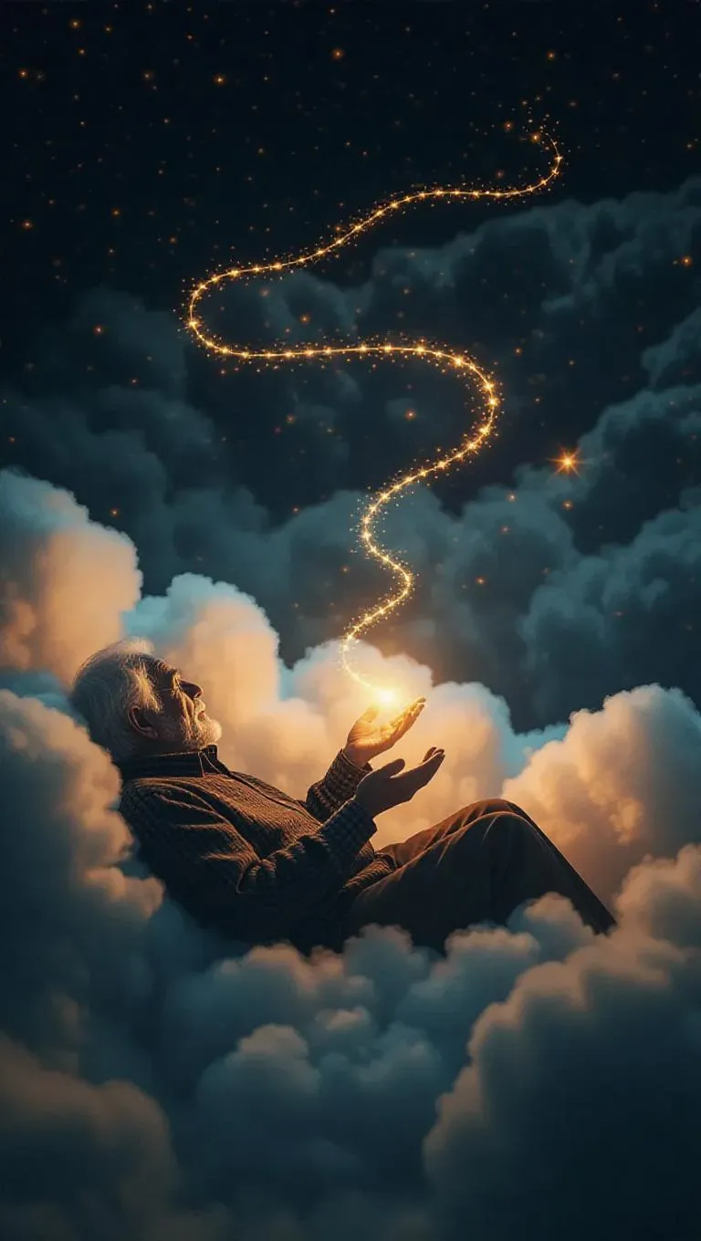 An elderly storyteller reclines on a puffy cloud, weaving tales with shimmering threads of starlight that twist into playful, whimsical shapes above their hands. Below, the world nods off beneath a thin blanket of haze, while fireflies flicker like enchanted sparks, ready to come alive.