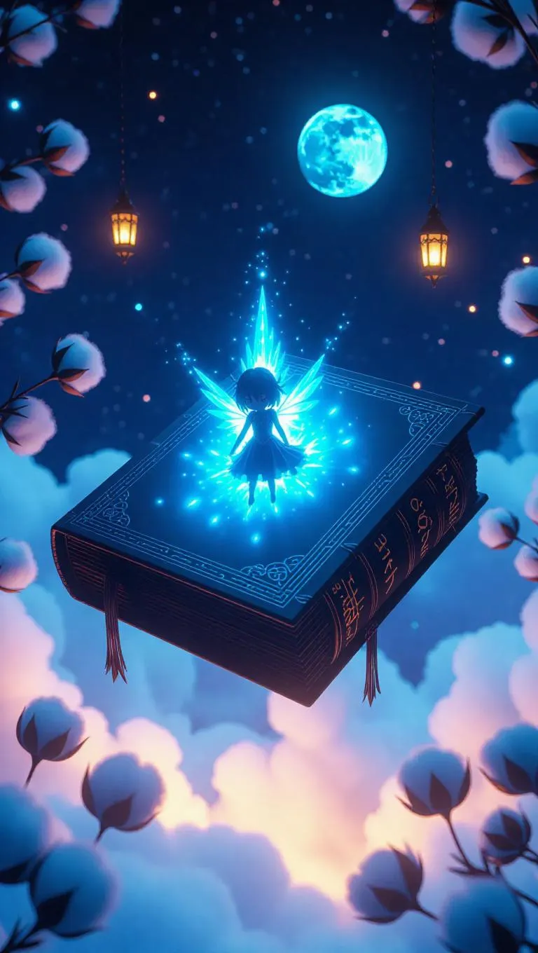 A miniature, radiant sprite lingers on an ancient, mythical book suspended in the air, its surface glowing with bright blue runes. Around them, dreamy cotton-like clouds extend endlessly, sprinkled with wondrous lanterns and light swaying blossoms, while a gentle aurora fills the far-off, moonlit sky.