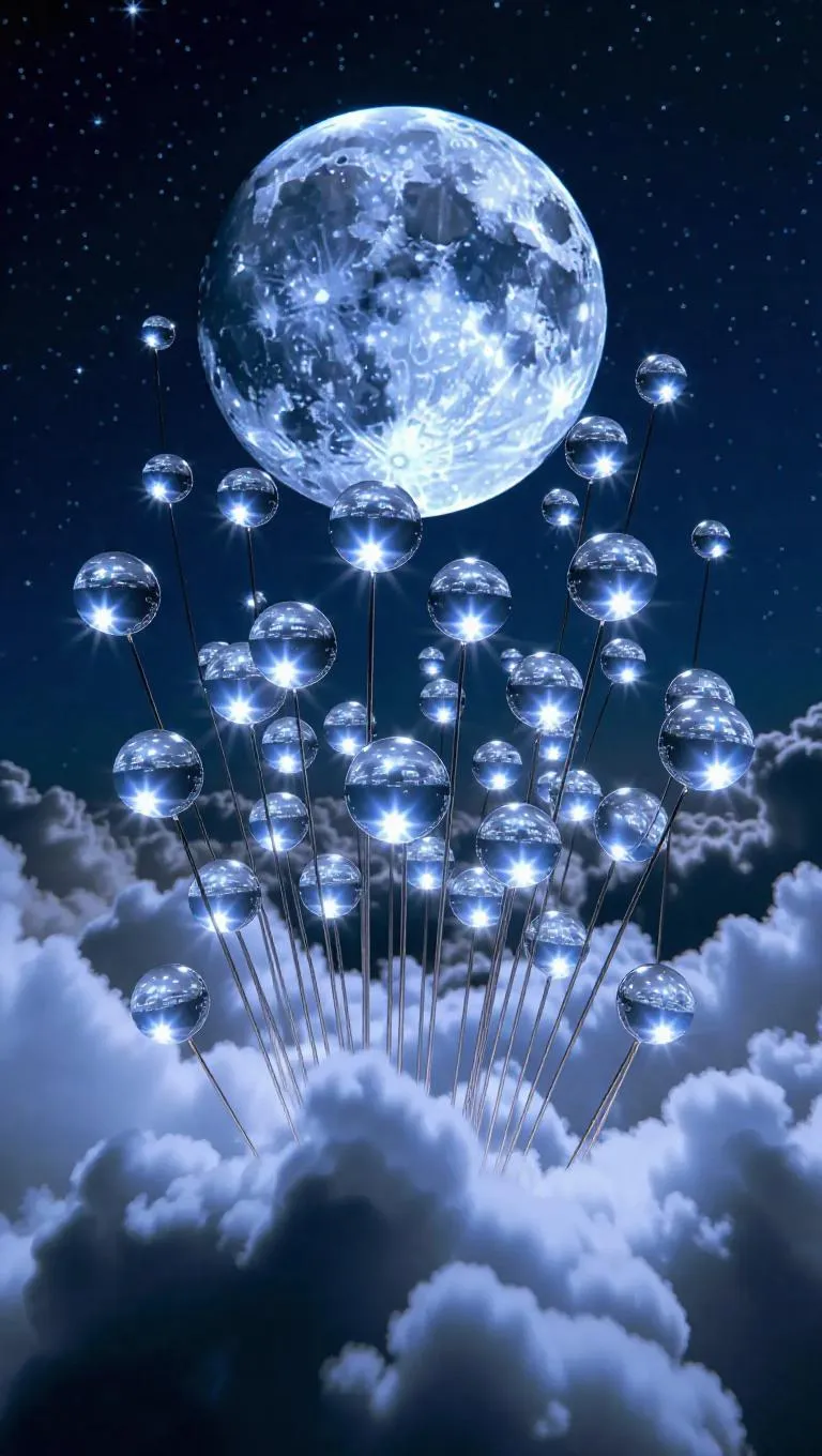 13. Enormous moonstone pins shimmer under the night sky on a blanket of clouds, players roll shining orbs filled with lunar dust, striking pins that break apart into bright bursts of silver light, ringing out like a choir of tiny celestial bells.