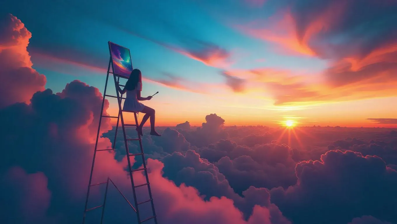 A girl perched on a ladder resting on an ethereal cloud, whimsically painting the sky with each stroke, transforming the colors of the sunset into a mesmerizing blend of vivid shades, capturing the magic of twilight