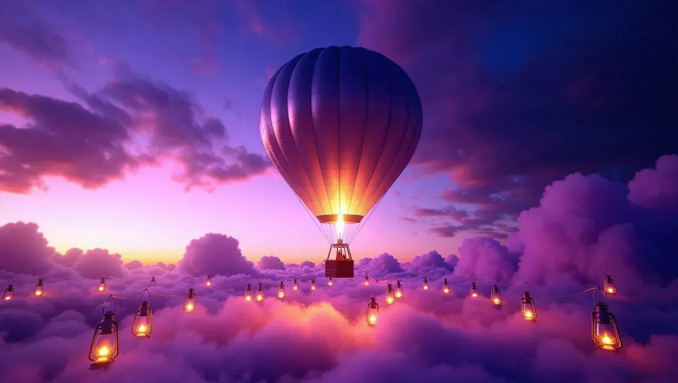 An elegant hot air balloon tethered to a silver-lined cloud, surrounded by glowing lanterns that cast a soothing, silvery light, creating a tranquil atmosphere in a sky painted with soft purples and blues.