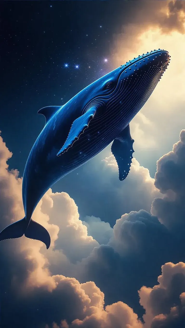 A colossal whale soaring through the sky, gliding gracefully over fluffy clouds, with shimmering stars entwined around its body, casting a mystical glow, creating a surreal and enchanting scene