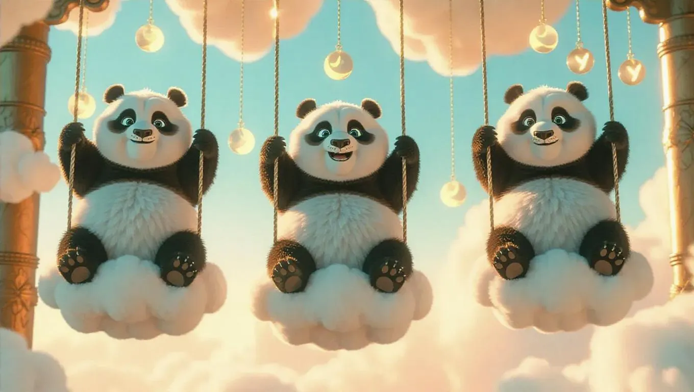Fluffy, fluffy cloud pandas swing joyfully between jeweled cloud pillars. Button noses twitch inquisitively, sleepy eyes sparkle with wonder as they grip glowing moon-shaped ropes. Puffy paws dangle freely, clouds billow softly beneath them. Tiny cloud fairies hitch rides, giggling as they soar through the warm sky, carried by the gentle breeze and the rhythmic sway of the panda swings.