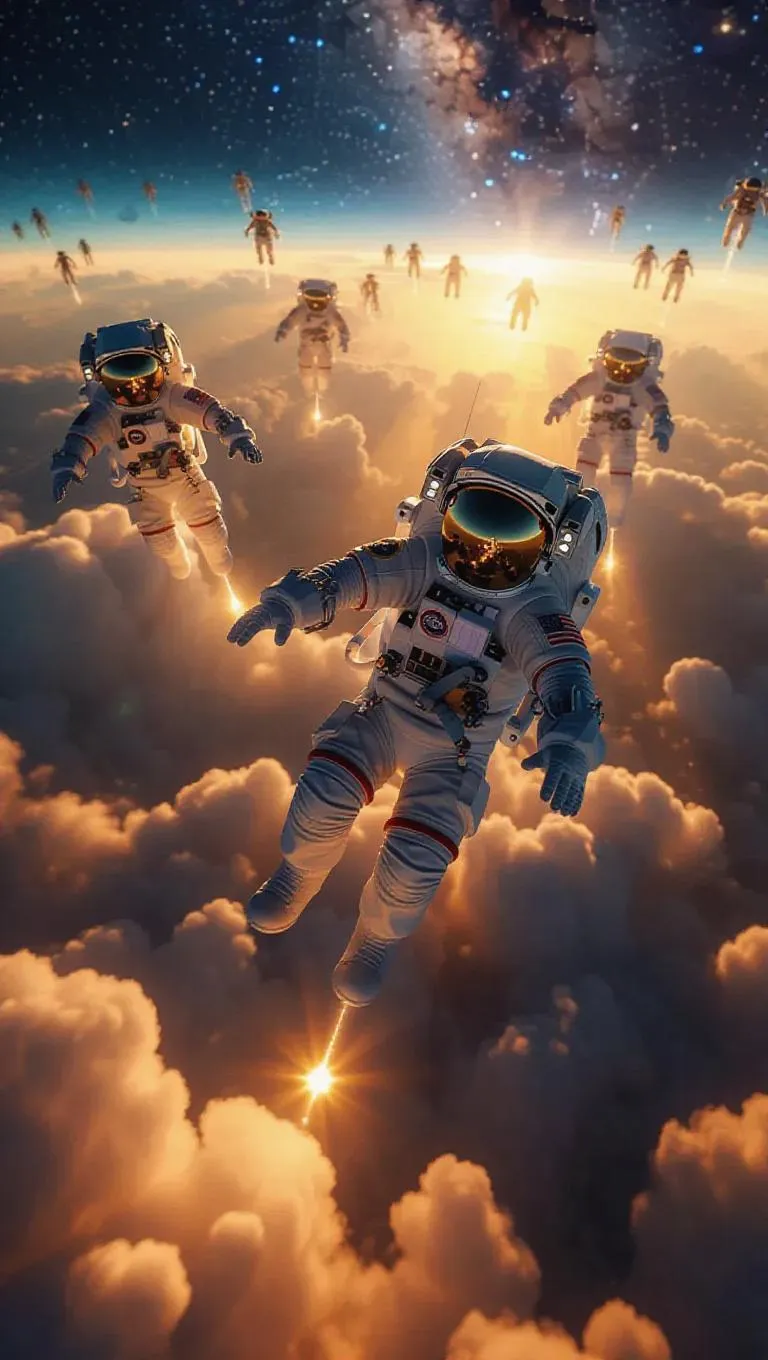 At 8,000 meters above the ground, astronauts float joyfully through the sky, embarking on a stellar exploration. They glide among dreamy clouds, their spacesuits twinkling in the warm sunlight. Some hold onto shooting stars like reins, guiding themselves through the celestial wonders. They pass by vibrant cloud gardens, peek into stardust-filled passages, and watch torrents of liquid light flow between suspended landmasses. Sparkling crystal-like clouds, animated constellations, and breathtaking sky phenomena surround them, creating a fantastical journey through the vast expanse.