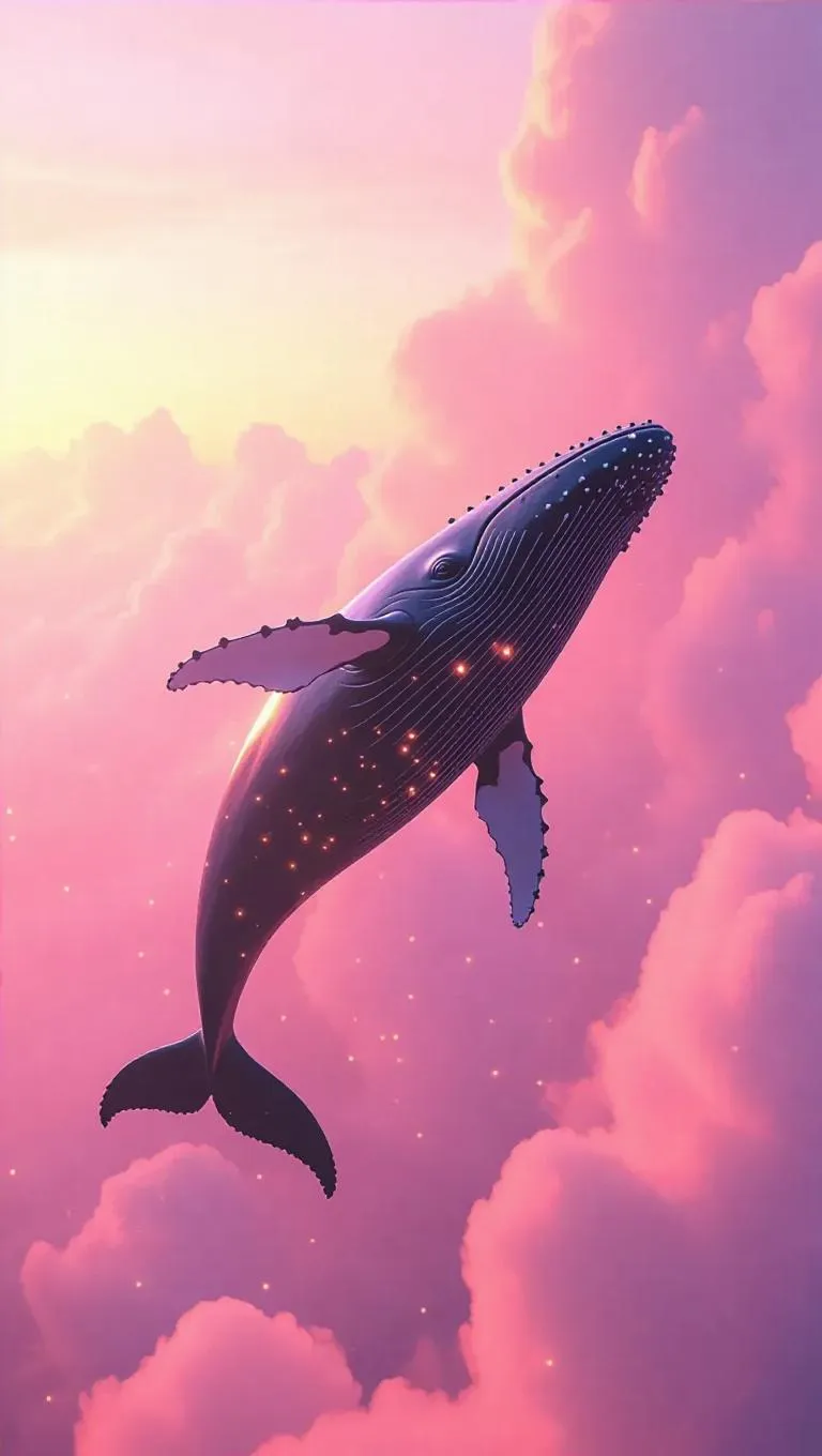 A colossal whale soaring through the sunset sky, gliding majestically over pink clouds, with twinkling fireflies entwined around its body, casting a mystical glow, creating a surreal and enchanting scene