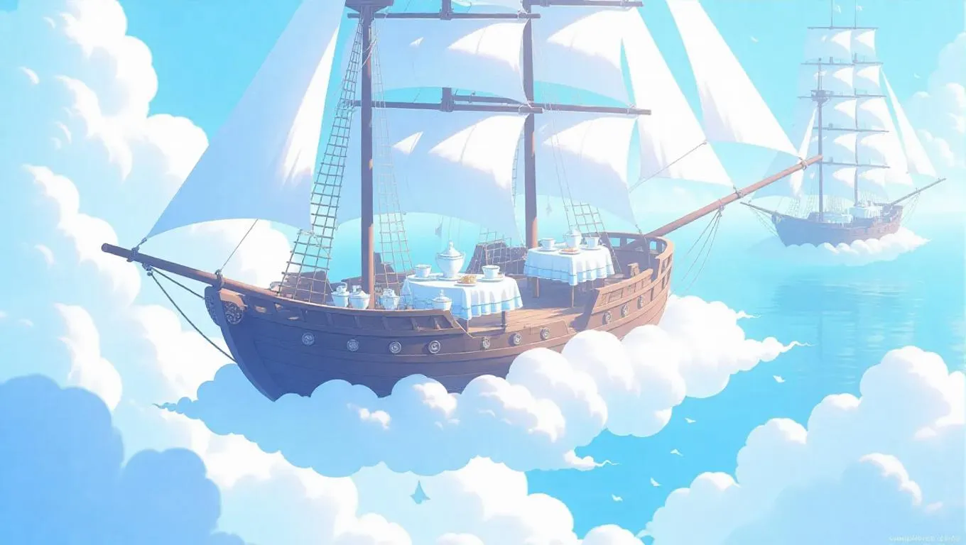 Handdrawn cartoon illustration style, a whimsical tea party on a floating cloud ship, delicate porcelain cups on nautical tables, airy blue and white tones, sunlight glimmering on shimmering sails, creating a fantastical sailing atmosphere.
