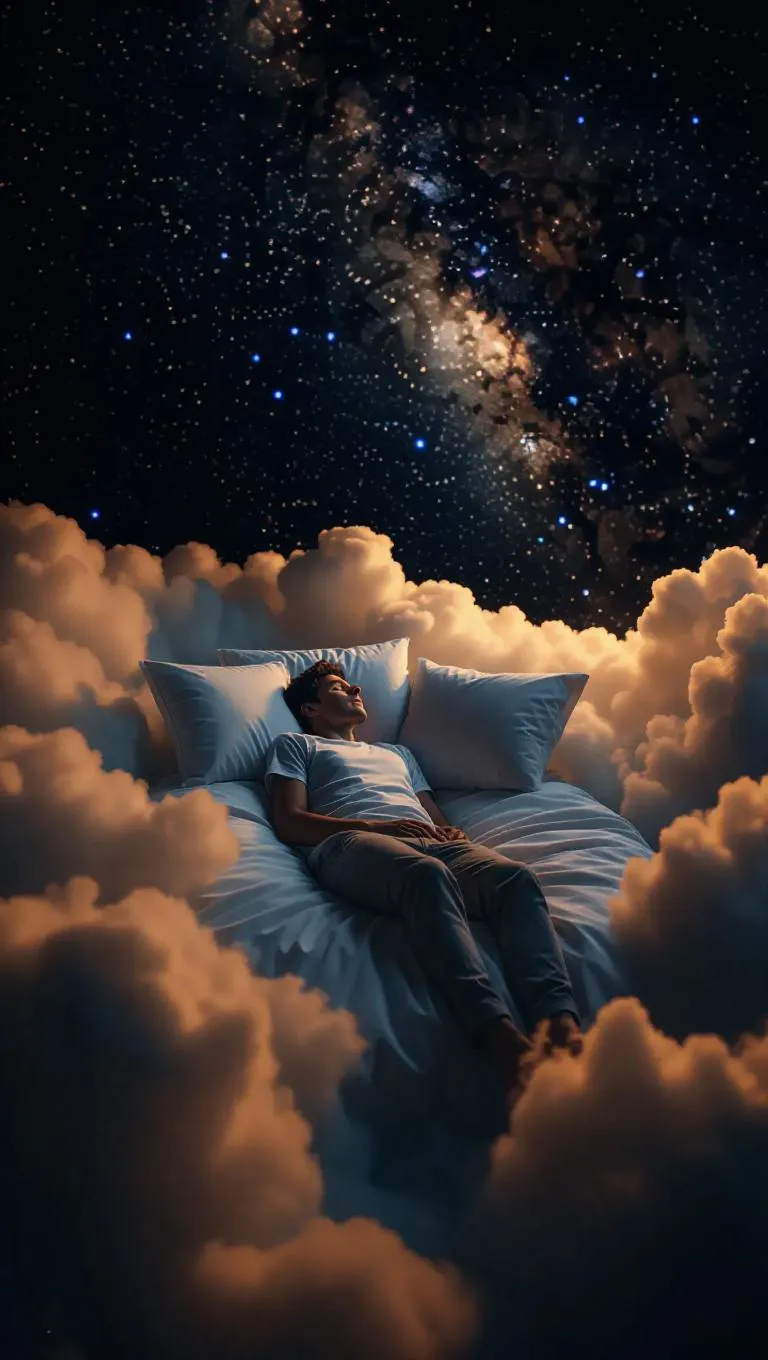 A bed made of clouds, with a person peacefully dreaming, floating among constellations