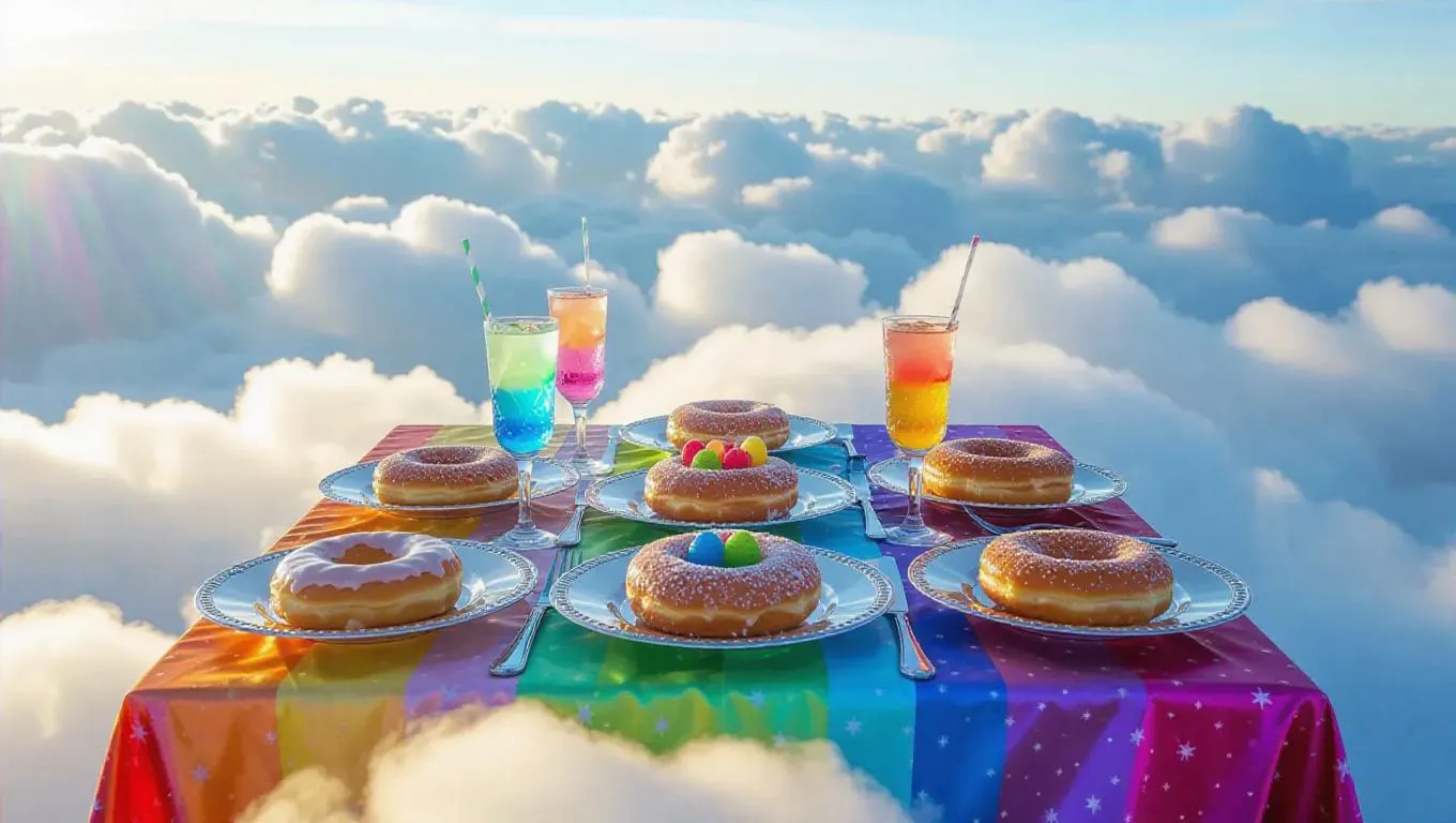 Above the clouds, a vibrant feast unfolds on a vast, cushioned expanse of soft, fluffy clouds. A colorful tablecloth, shimmering with tiny star-like sparkles, is spread out, adorned with an array of appetizing treats. Silver plates hold doughnuts made with glaze as sweet as clouds, filled with slices of radiant fruits that seem to capture the essence of the sun, surrounded by fluffy pastries and sparkling beverages.