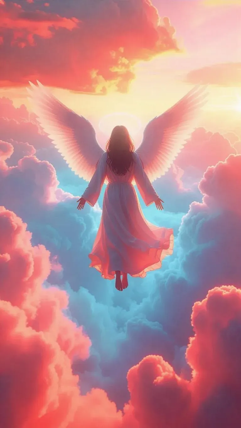 An angelic being soaring above luminous clouds, wings unfurled majestically, halo of radiant light surrounding them. The sky is a vivid coral, evoking a sense of divine energy and warmth.