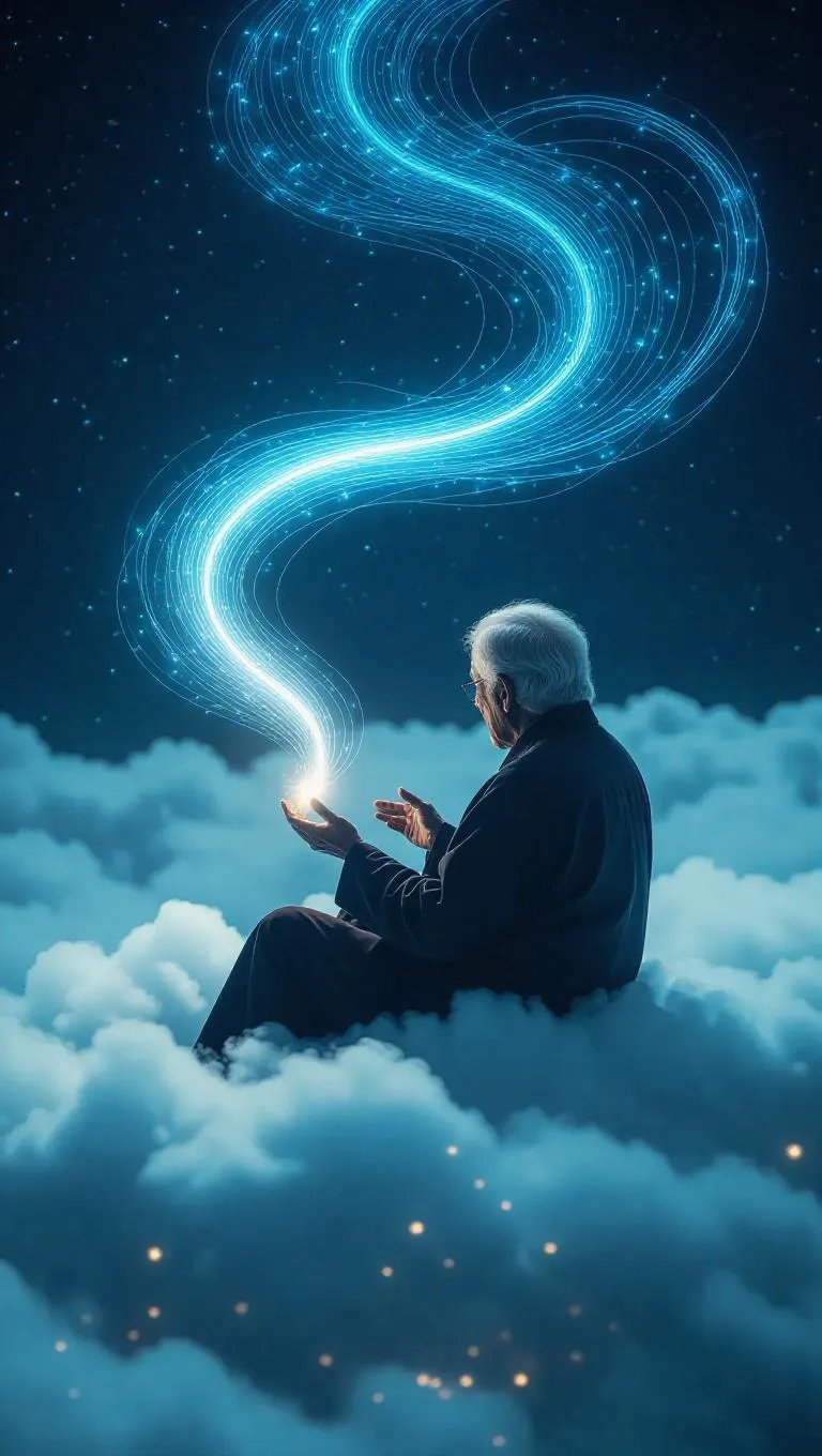 An elderly storyteller sits atop a fluffy cloud, weaving tales with shimmering threads of starlight that twist into bold, fierce shapes above their hands. Below, the world sleeps under a fine blanket of fog, while fireflies burst like hidden gems, ready to come alive.