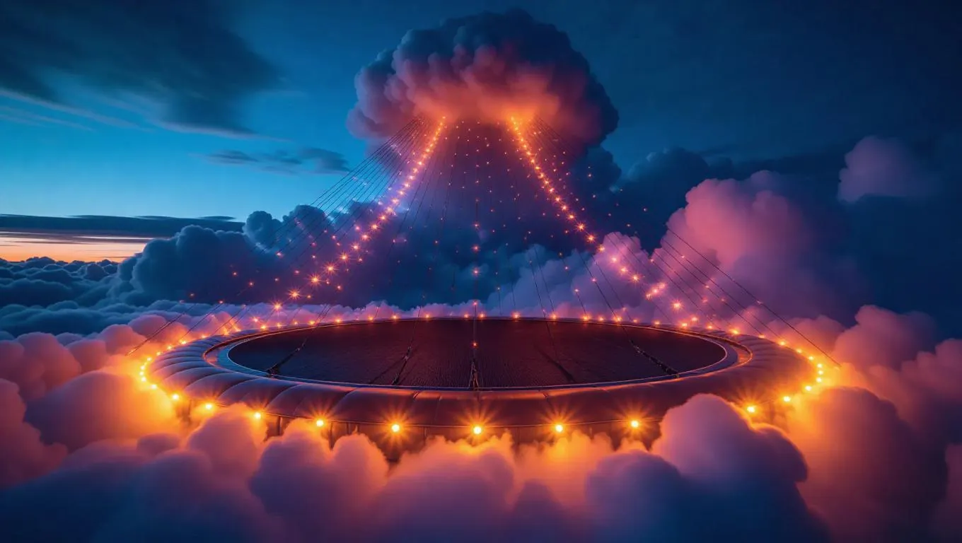 20. Towering cloud slides swoosh down from the azure twilight sky, their surfaces dusted with luminous crystals. Children slide down at breakneck speed, leaving behind long, luminous trails of ethereal light that arc gracefully through the air. At the base, a soft, fluffy cloud trampoline awaits, and every joyful jump sends countless sparkling specks flying into the fanciful atmosphere.
