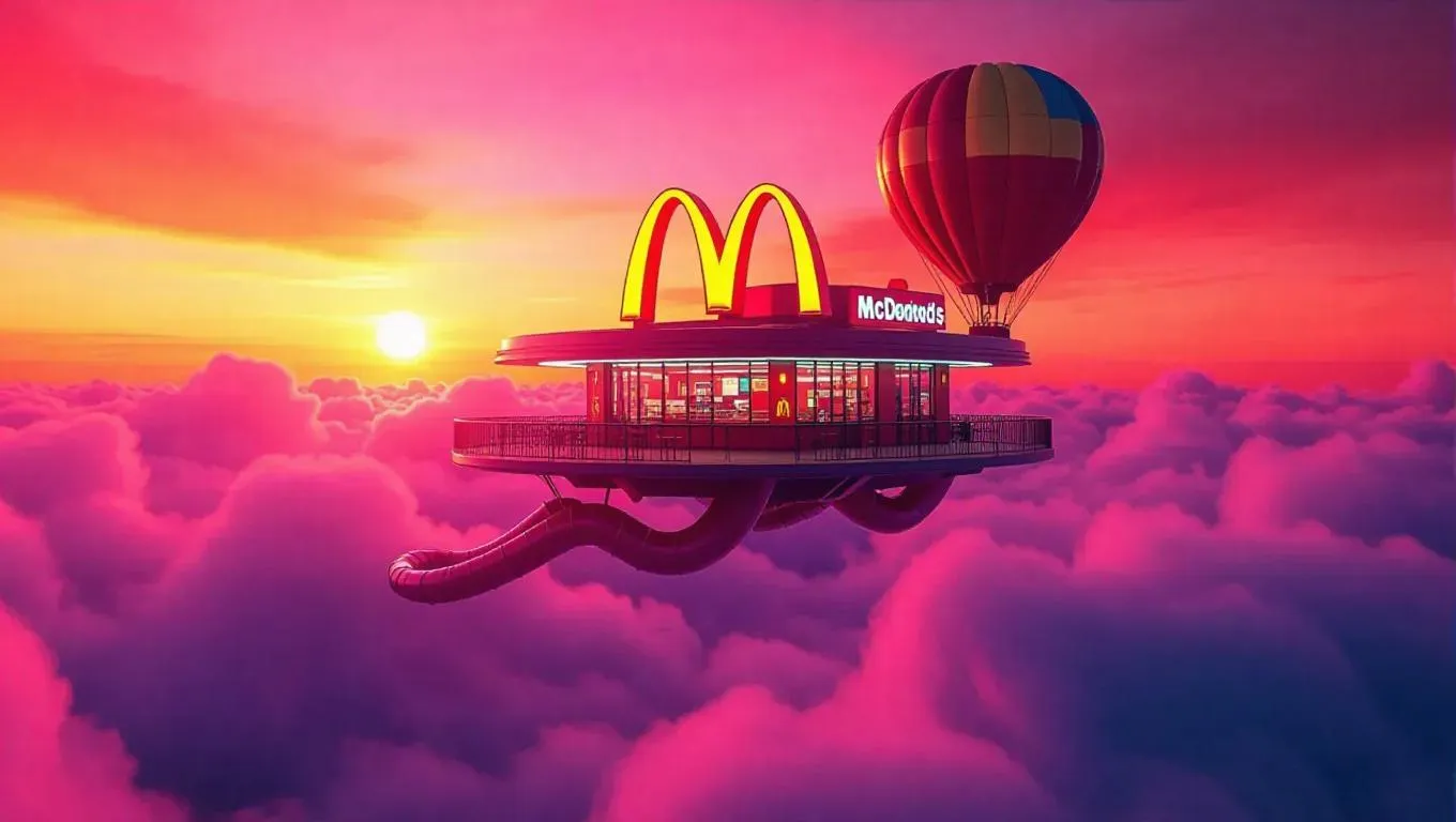 A whimsical McDonald's restaurant floating above a sea of fluffy white clouds, the iconic golden arches glowing warmly against a bright red sunset. The restaurant features a giant spiral slide and a colorful hot air balloon tethered nearby, adding a vibrant, playful twist.