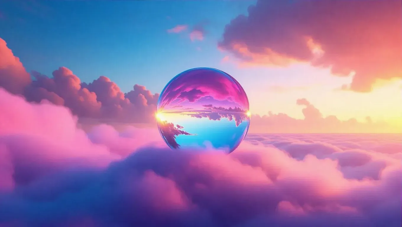 A glowing crystal orb perched on a soft cloud, mirroring the colorful shades of the sky above, with gentle tendrils of mist curling beneath, evoking a dreamlike and enchanting environment.