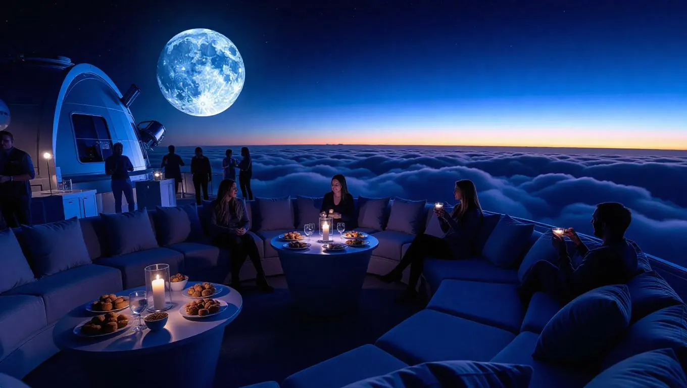 Guests unite on extensive, heavenly cloud expanses complete with high-tech telescopes and comfy seating sections. Skilled astronomers unveil enchanting tales and knowledge about the cosmos, while others savor delightful snacks of air-spun treats and starlit beverages under the shimmering light of a full moon.