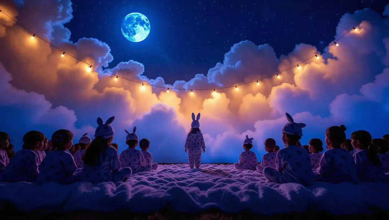 Aunt Moon crafts a luminous blanket runway across the twilight clouds with glistening moonbeams, young models walk in playful animal pajamas. Rabbit pajamas hop softly with each step, celestial nightcaps play magical stories. The audience is starry-eyed children nestled in cozy woolen throws.