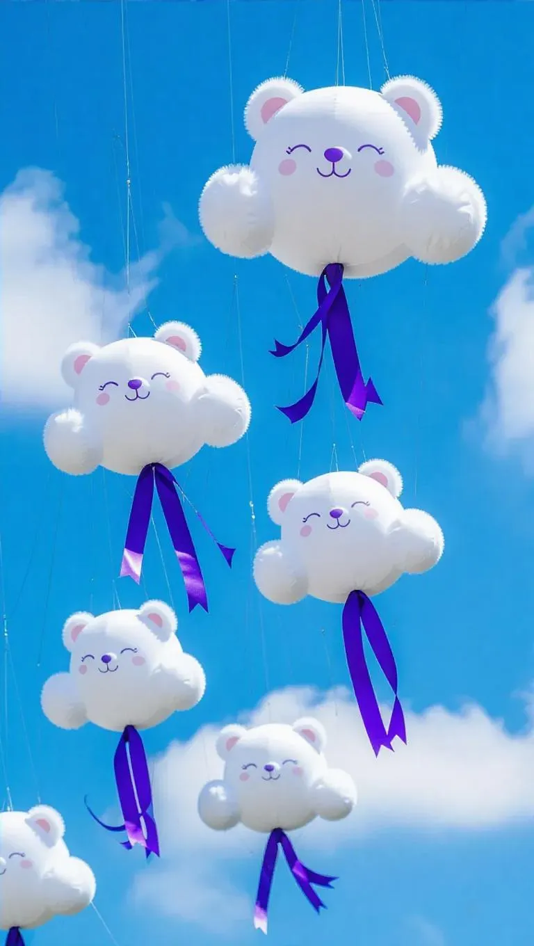 Fuzzy, cloud kites shaped like bears with round ears and soft tails flutter in the sky, each adorned with a purple ribbon trailing in a dazzling stream. Cherubic sky sprites laugh as they tug on the strings, making the kites perform loops and chase floating cupcake clouds.
