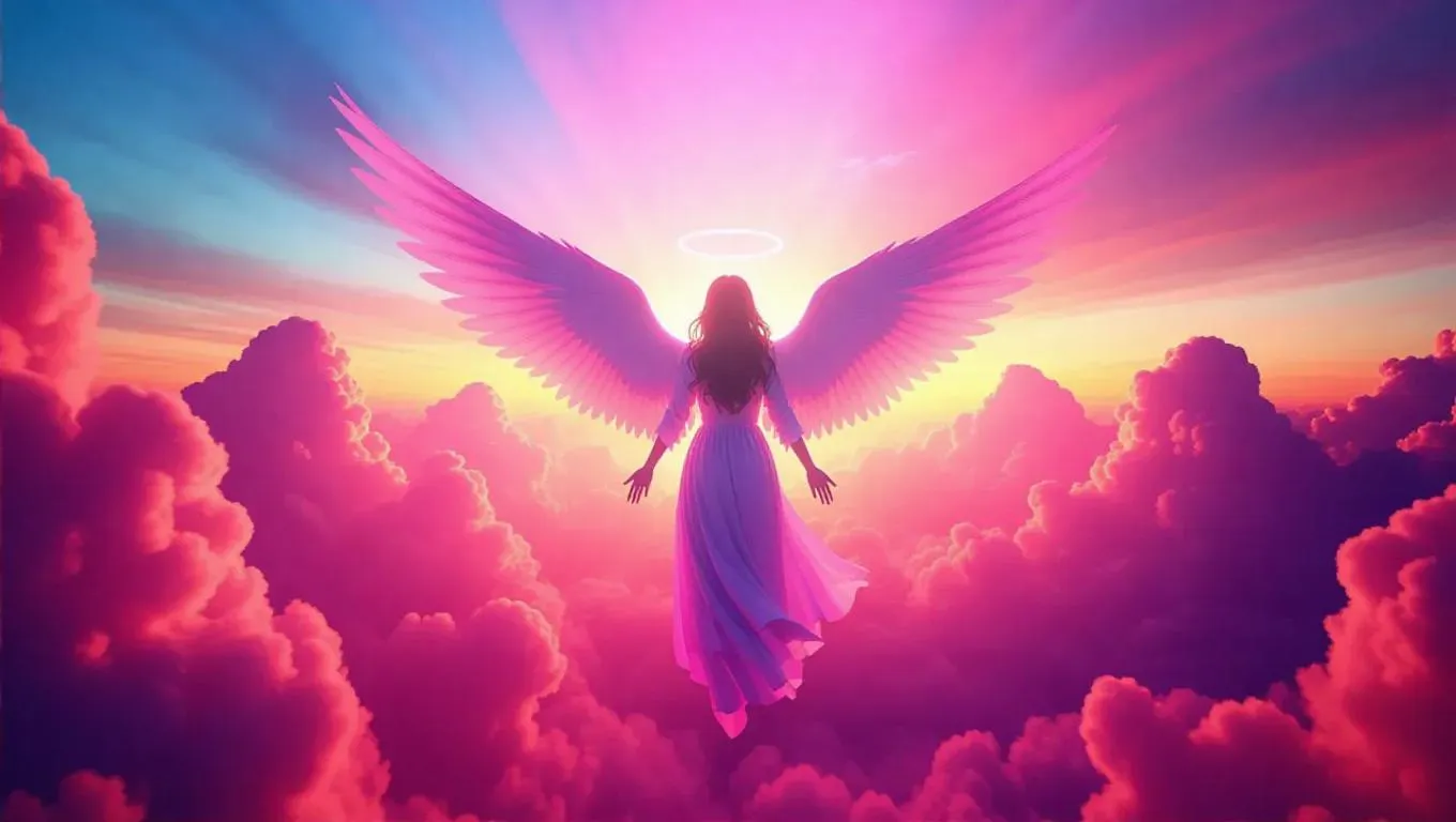 An angelic being soaring above vibrant, colorful clouds, wings spread wide, halo of radiant light surrounding them. The sky is a gorgeous, colorful twilight, evoking a sense of divine wonder and beauty.