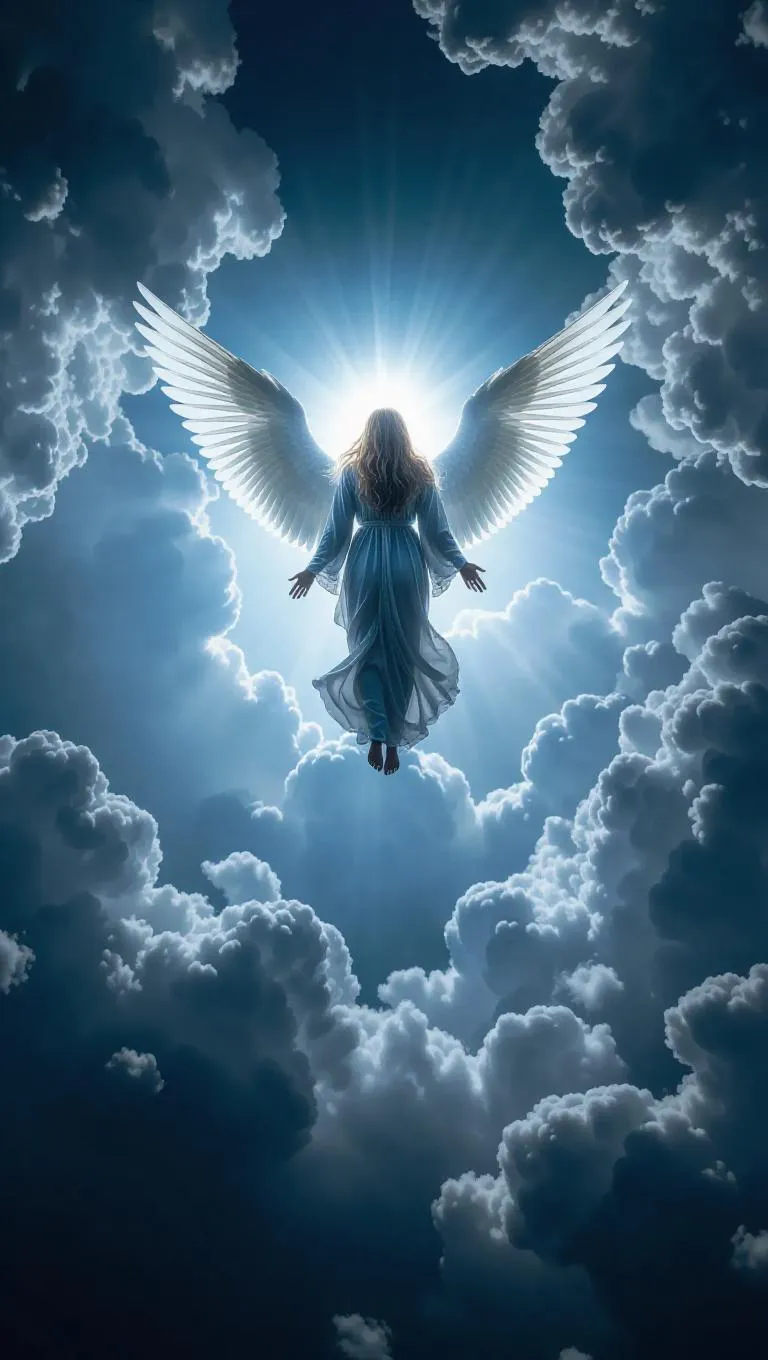 An angelic being soaring above light, airy clouds, wings spread wide, halo of radiant light surrounding them. The sky is a deep navy blue, evoking a sense of divine mystery and depth.