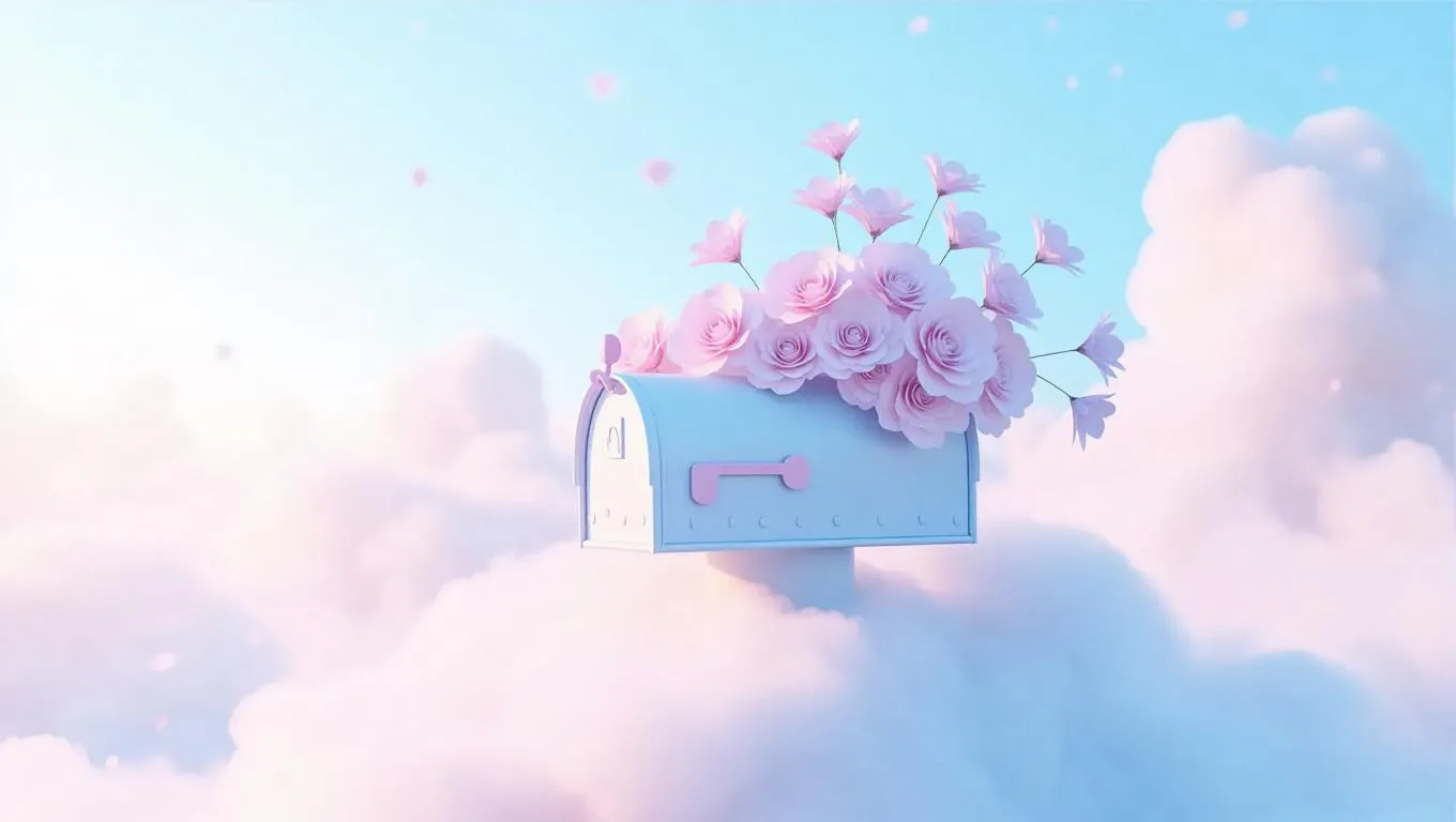 A whimsical mailbox perched atop a fluffy cloud, with delicate paper flowers fluttering out, creating a magical sky filled with pastel colors and soft, ethereal light.