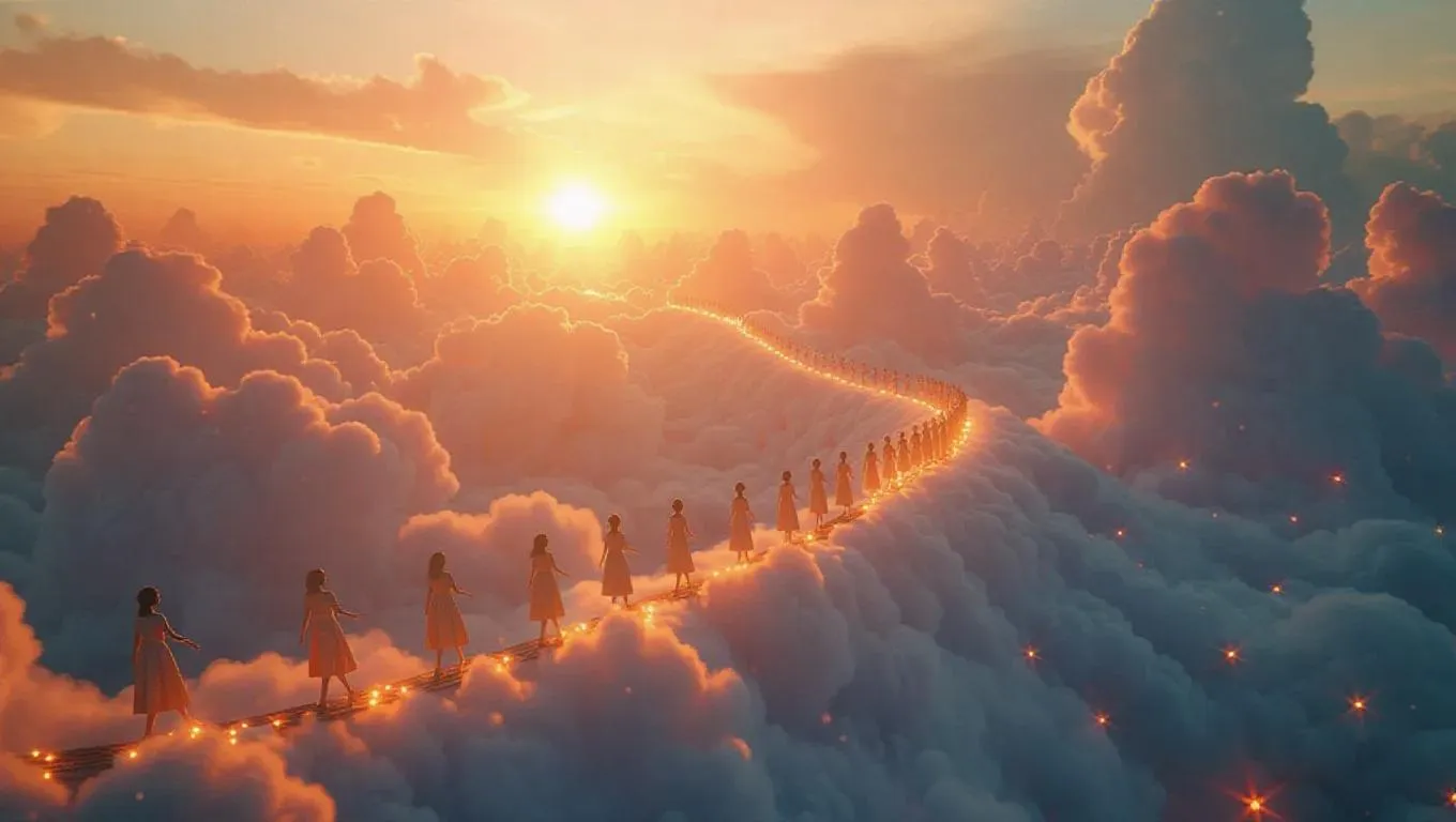 Aunt Sun weaves a magical blanket runway across the sunset clouds with twinkling fireflies, young models walk in whimsical fairy tale costumes. Cat pajamas meow gently with each step, moon nightcaps play cheerful melodies. The audience is dreamers nestled in soft marshmallow pillows.