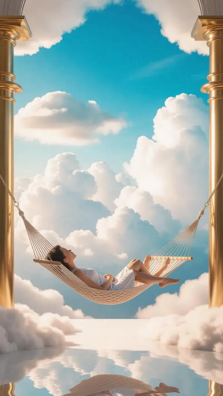 Suspended between two shimmering gold-cloud pillars, these hammocks woven from soft, breathable cloud-fibers sway gently with the breeze. Lying in them, you can bask in the serene rocking motion, gazing up at the expansive colorful sky and fluffy clouds, enveloped in a tranquil, stress-free atmosphere.