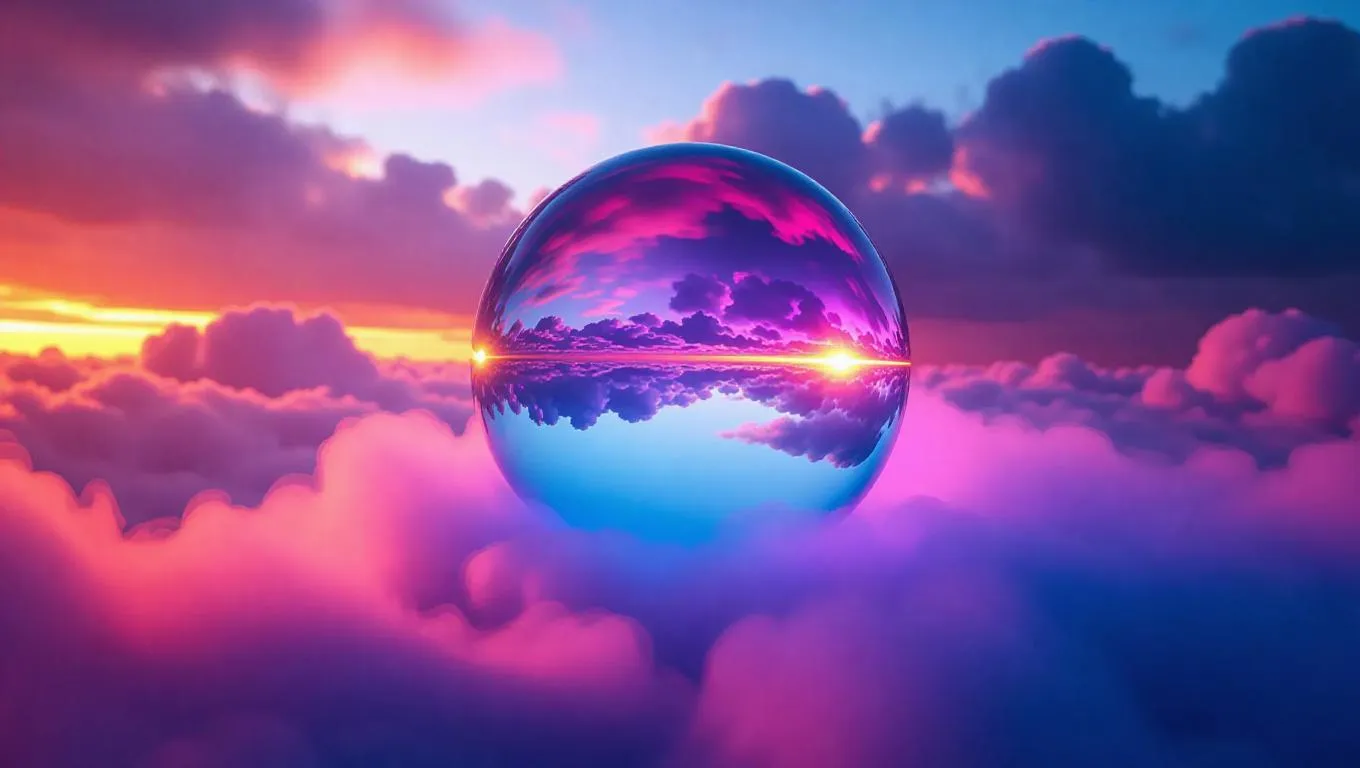 A luminous crystal orb resting on a fluffy cloud, reflecting the vibrant hues of the sky around it, with wisps of mist swirling gently below, creating an ethereal and magical atmosphere.