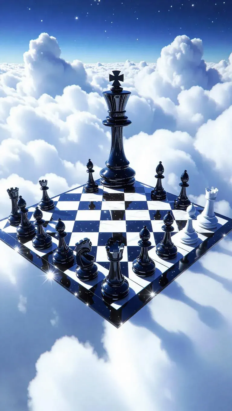 A colossal, shimmering chessboard floats serenely above the clouds, its black and white squares crafted from polished stardust. Each square glows softly, edges lined with miniature, floating constellations. Massive, living chess pieces—knights as noble griffins, bishops as luminous moonbeasts—move gracefully, casting long shadows on the cloud-sea below.