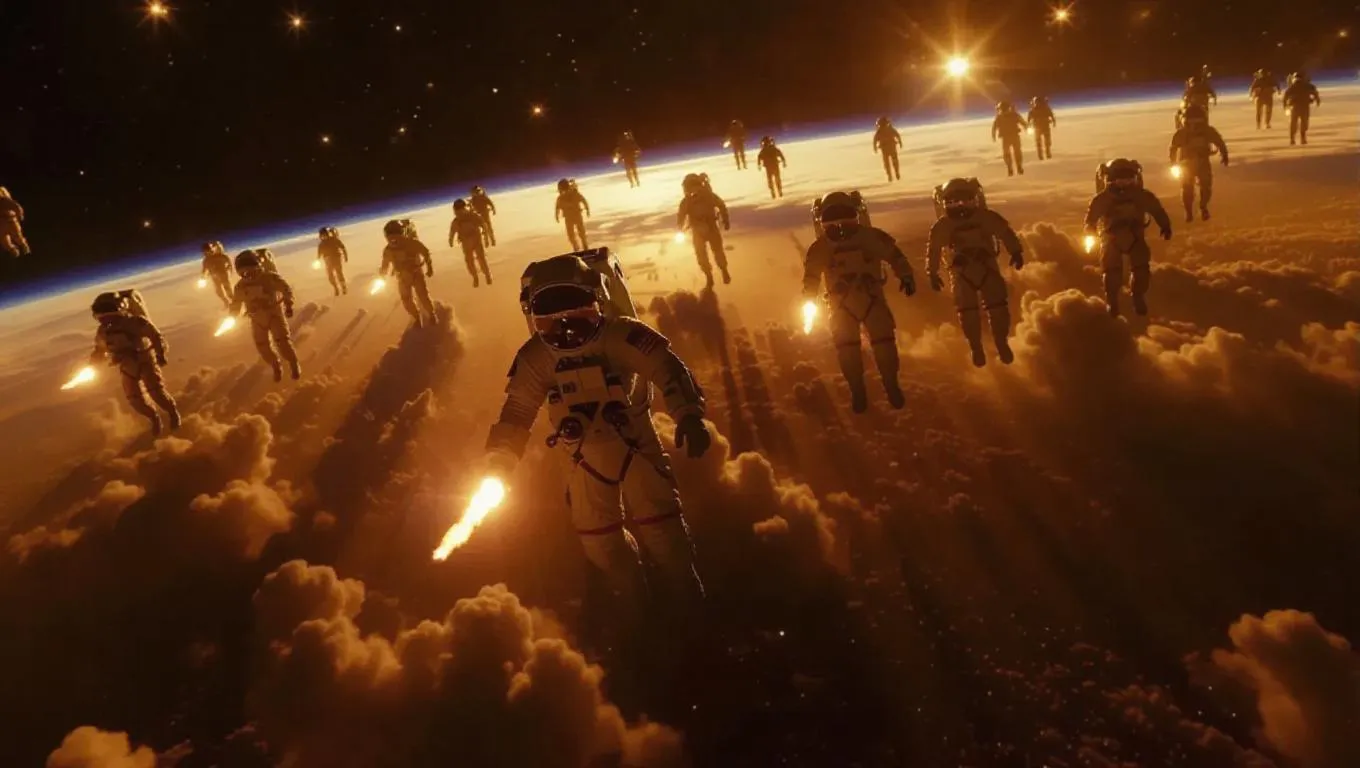 At 8,000 meters above the ground, explorers float lightly through the sky, embarking on a cosmic odyssey. They glide among billowy clouds, their suits shining brilliantly in the sunlight. Some hold onto shooting flames like reins, guiding themselves through the interstellar realm. They pass by glittering cloud palaces, peek into vast stardust-filled spaces, and watch streaks of radiant light flow between floating islands. Brilliant diamond-like clouds, evolving constellations, and mesmerizing sky occurrences envelop them, creating a phenomenal excursion through the cosmos.