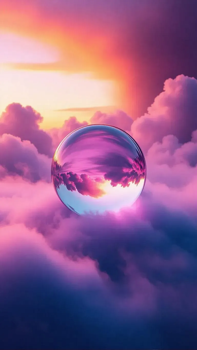 A radiant crystal orb situated on a billowy cloud, displaying the brilliant colors of the sky surrounding it, with soft wisps of fog drifting below, producing a surreal and mystical vibe.
