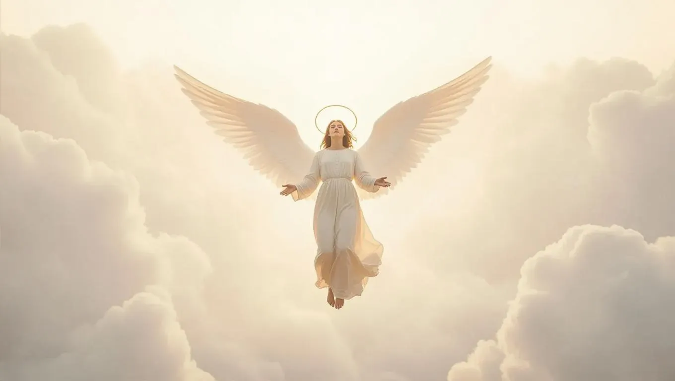 An angelic being soaring above soft, gray clouds, wings spread wide, halo of radiant light surrounding them. The sky is a muted, gentle beige, evoking a sense of divine softness and embracing warmth.