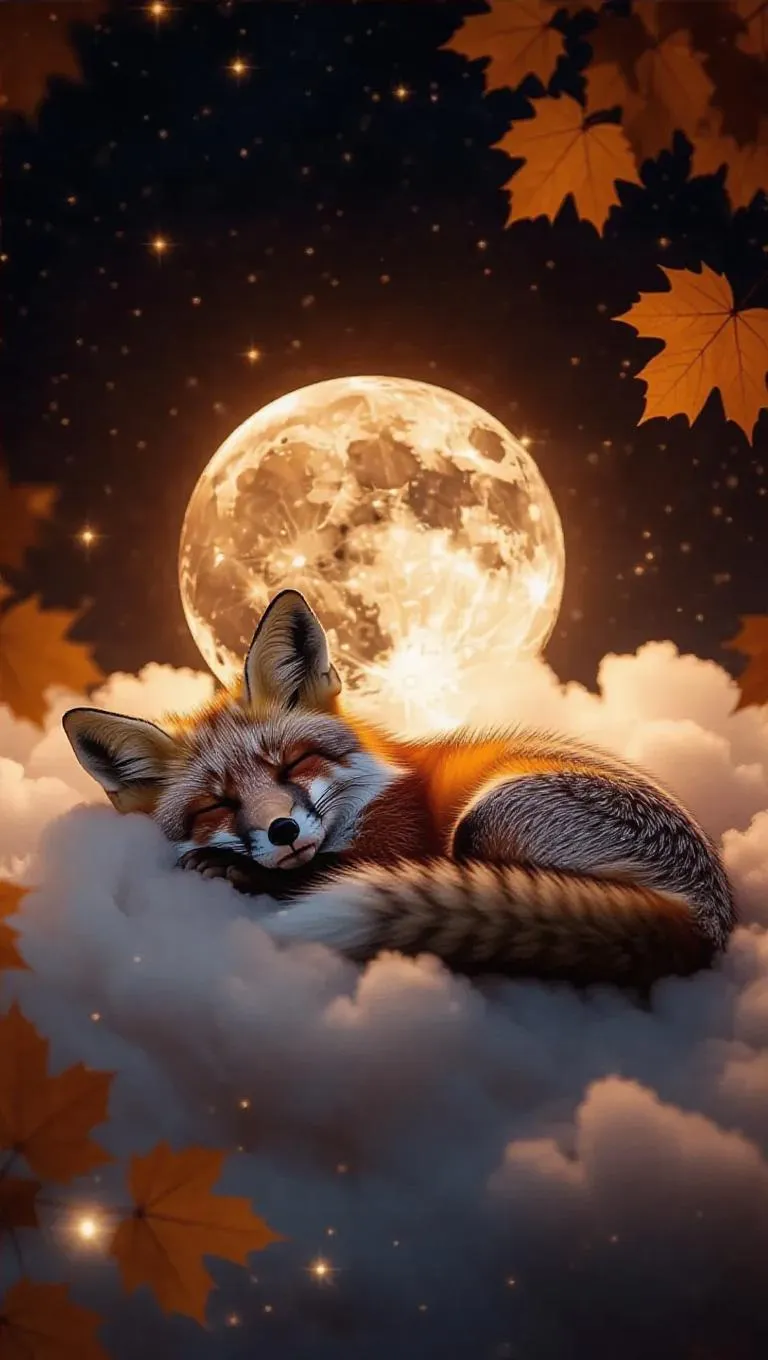 A fox snoozing on a fluffy cloud, illuminated by the soft, warm glow of an autumn moon, surrounded by twinkling stars and light puffs of fog, creating a cozy and romantic atmosphere.
