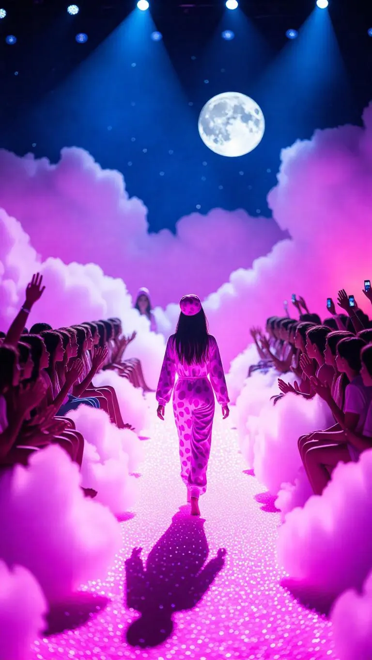 Aunt Moon creates a whimsical blanket runway across the cotton candy skies with glittering sunbeams, young models walk in funky pop pajamas. Giraffe pajamas stretch softly with each step, vibrant nightcaps play upbeat rhythms. The audience is joyful kids nestled in buoyant sugar clouds.