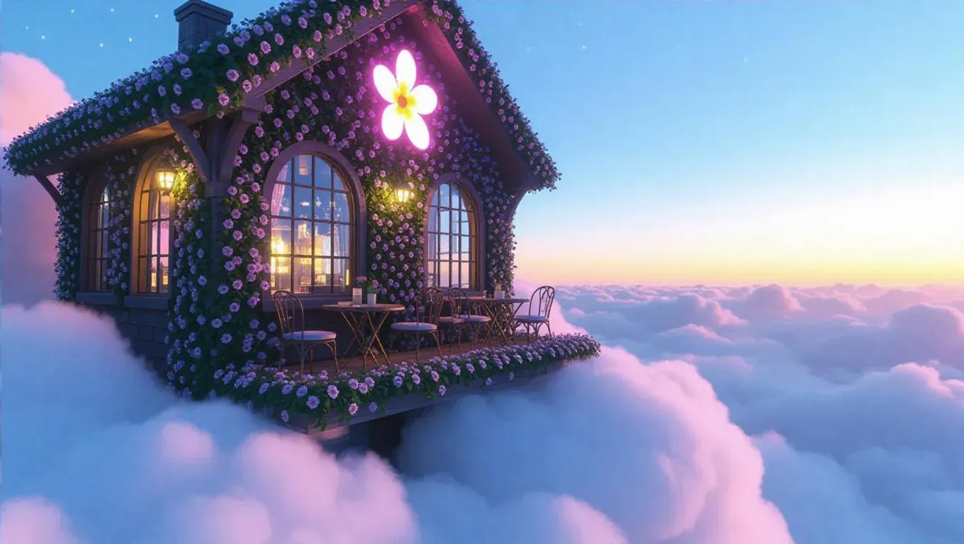 Above the clouds, a picturesque garden café perches on a fluffy cloud platform. Its floral walls shimmer with twinkling starlight, and a glowing flower sign beckons visitors. Large windows frame breathtaking views of the sky, allowing fresh air to flood the cozy interior.