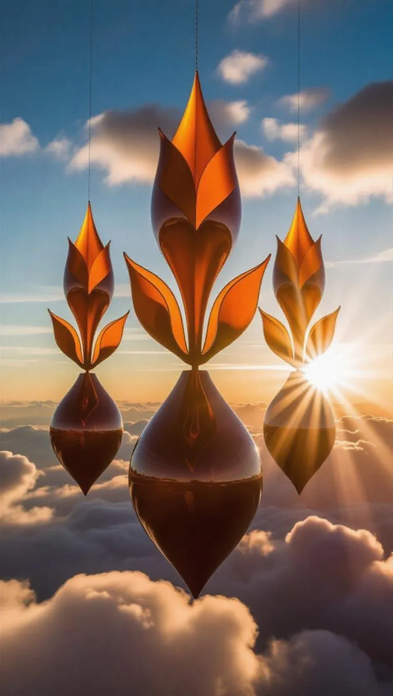 The sculptures are made from a warm-toned resin that can radiantly float overhead among the clouds. They are crafted in shapes like antique symbols, water fountains, or beautiful florals. These sculptures radiate a sense of elegance, generating a calm and soothing ambience. The afternoon's soft rays walk through their expanse, creating delicate designs on the clouds below.