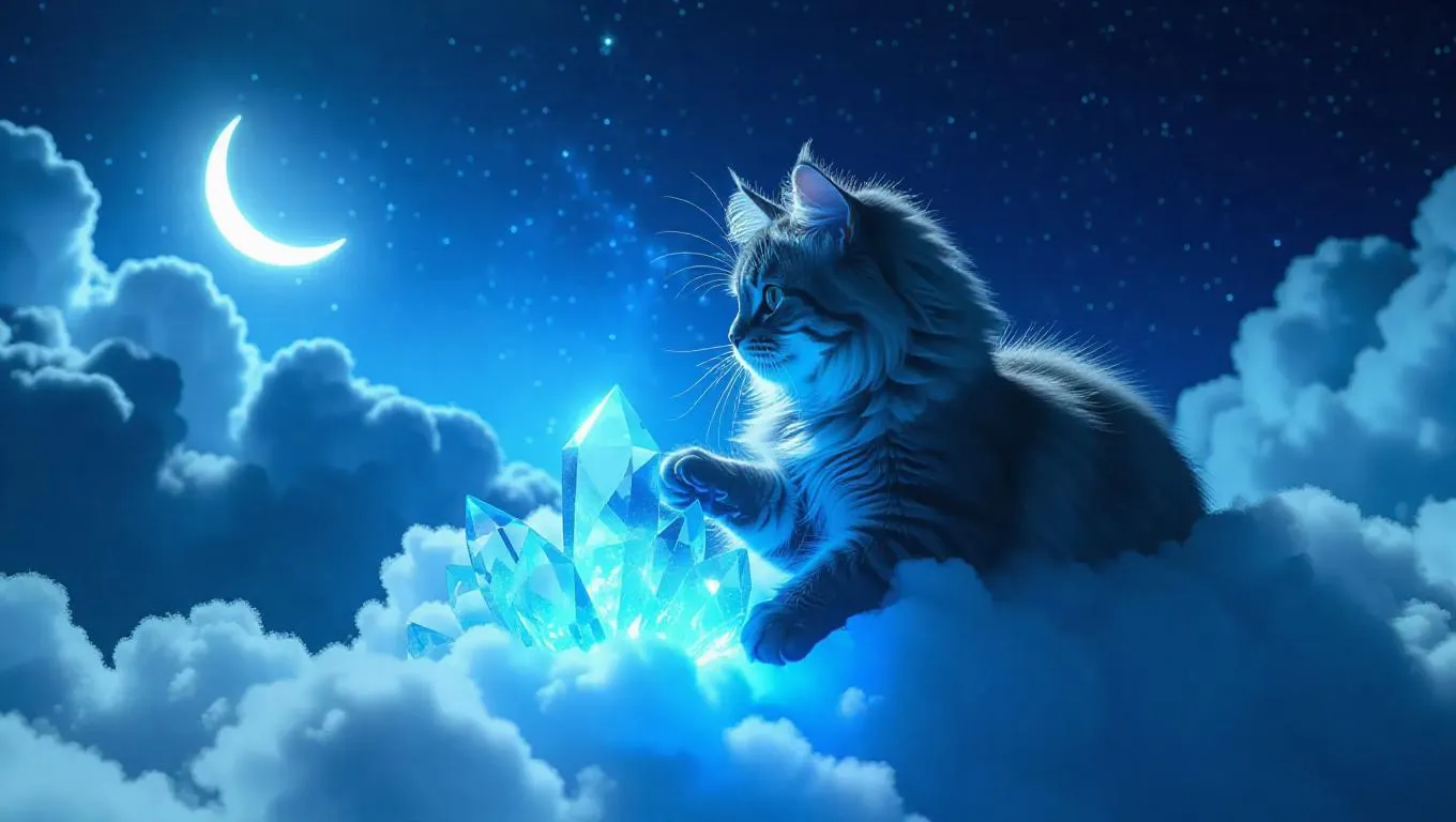 A fluffy cat perched on a fluffy cotton-soft cloud, mischievously tapping at glowing crystal shards, surrounded by a celestial blue sky with scattered stars and a glowing crescent moon, creating a whimsical and magical atmosphere.