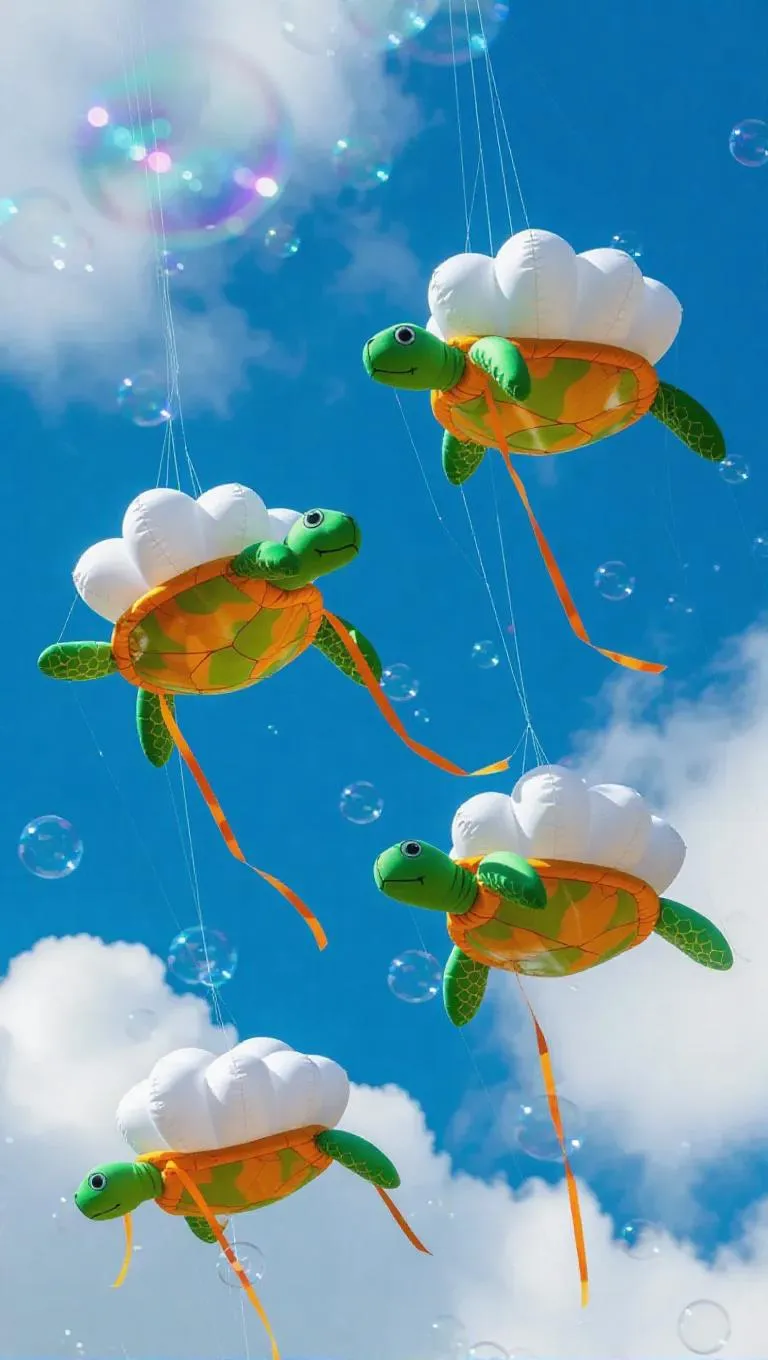 Fuzzy, cloud kites shaped like turtles with rounded shells and tiny tails flutter in the sky, each adorned with an orange ribbon trailing in a shimmering stream. Cherubic sky sprites playfully tug on the strings, making the kites perform spirals and chase floating bubblegum clouds.
