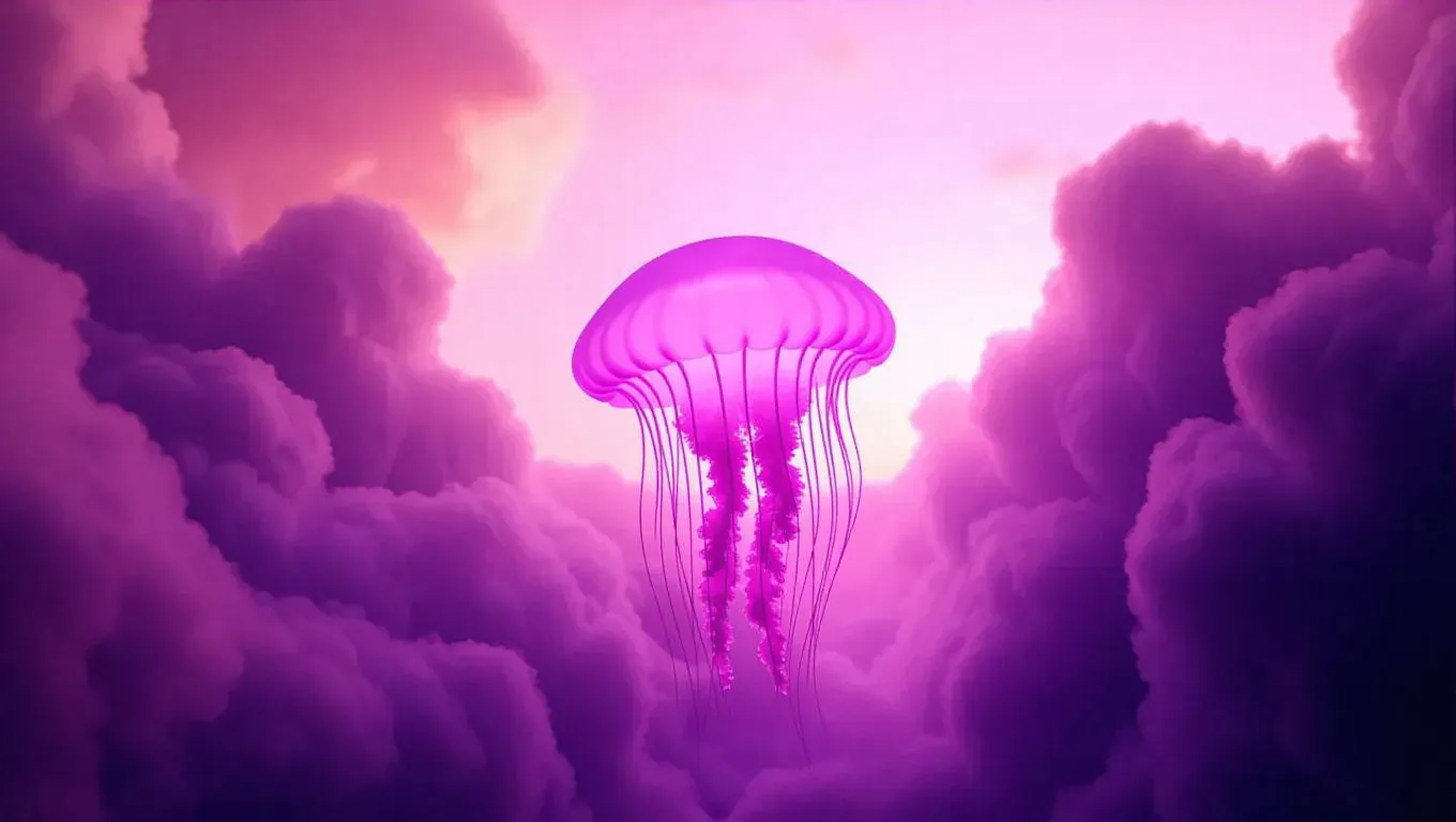 A luminescent jellyfish drifting through shimmering clouds, soft pink sky glowing with a dreamy, otherworldly aura, creating a serene and mystical atmosphere